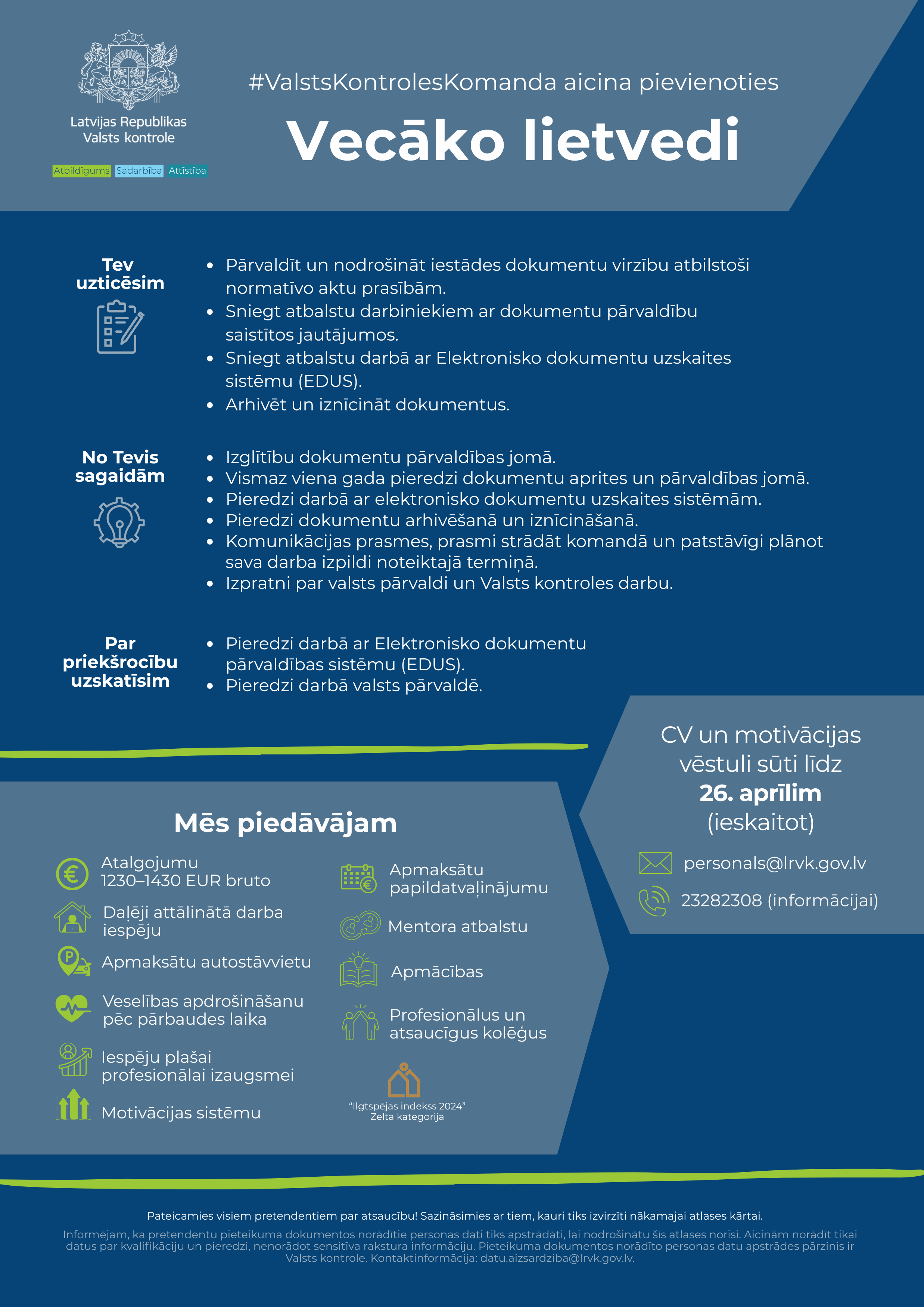 CV un motivācijas vēstuli ar norādi “Konkursam uz vecākā lietveža amatu” gaidīsim līdz 2026. gada 26. aprīlim (ieskaitot)