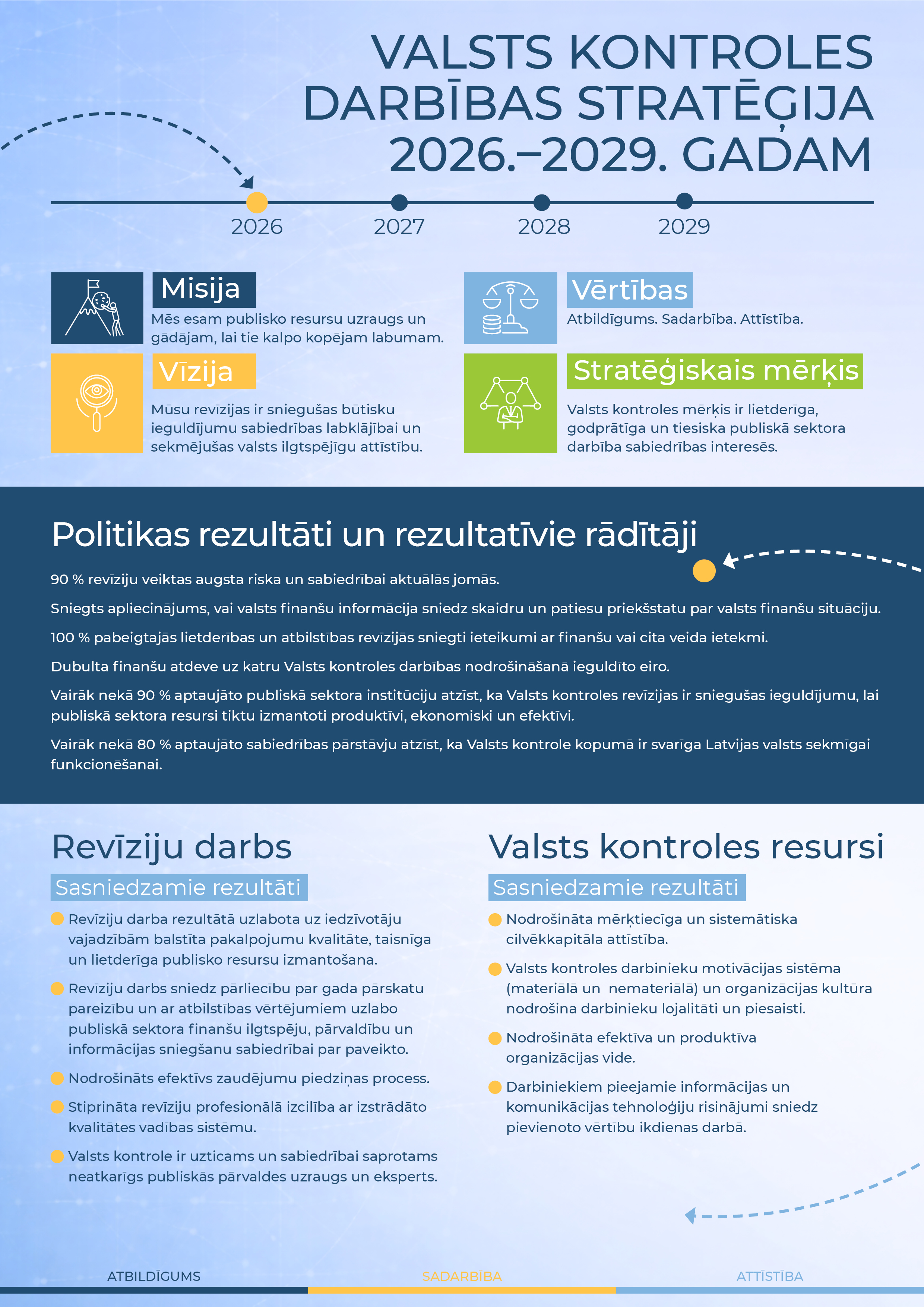Valsts kontroles darbības stratēģija 2026.–2029.gadam ir vidēja termiņa politikas dokuments, kurā noteikti Valsts kontroles stratēģiskie mērķi, prioritātes un plānotie rezultāti turpmākajiem četriem gadiem.