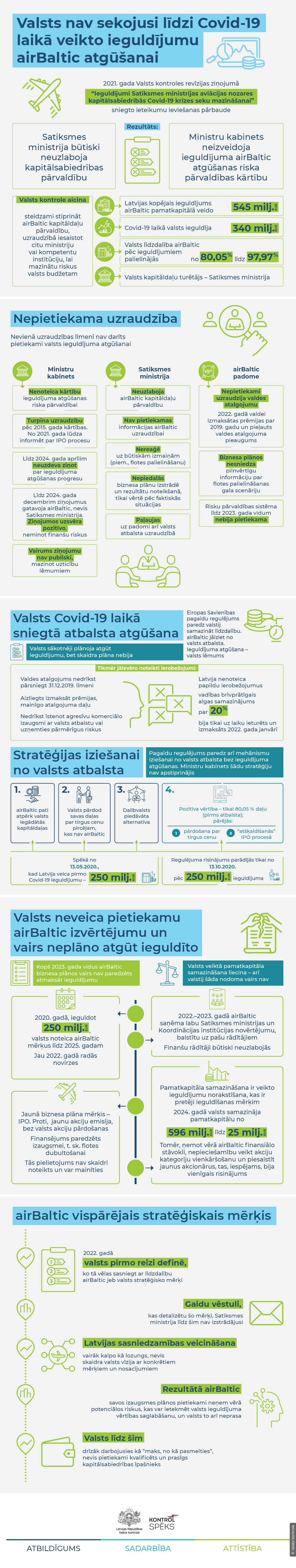 Valsts kontrole veikusi 2021. gada revīzijā sniegto ieteikumu ieviešanas pārbaudi par valsts uzraudzību pār Covid-19 laikā veikto ieguldījumu uzņēmumā airBaltic. Secinājums: nevienā no uzraudzības līmeņiem – Satiksmes ministrija, airBaltic padome, Ministru kabinets – nav veiktas pietiekamas darbības, kas, iespējams, sekmētu valsts ieguldījuma atgūšanu.