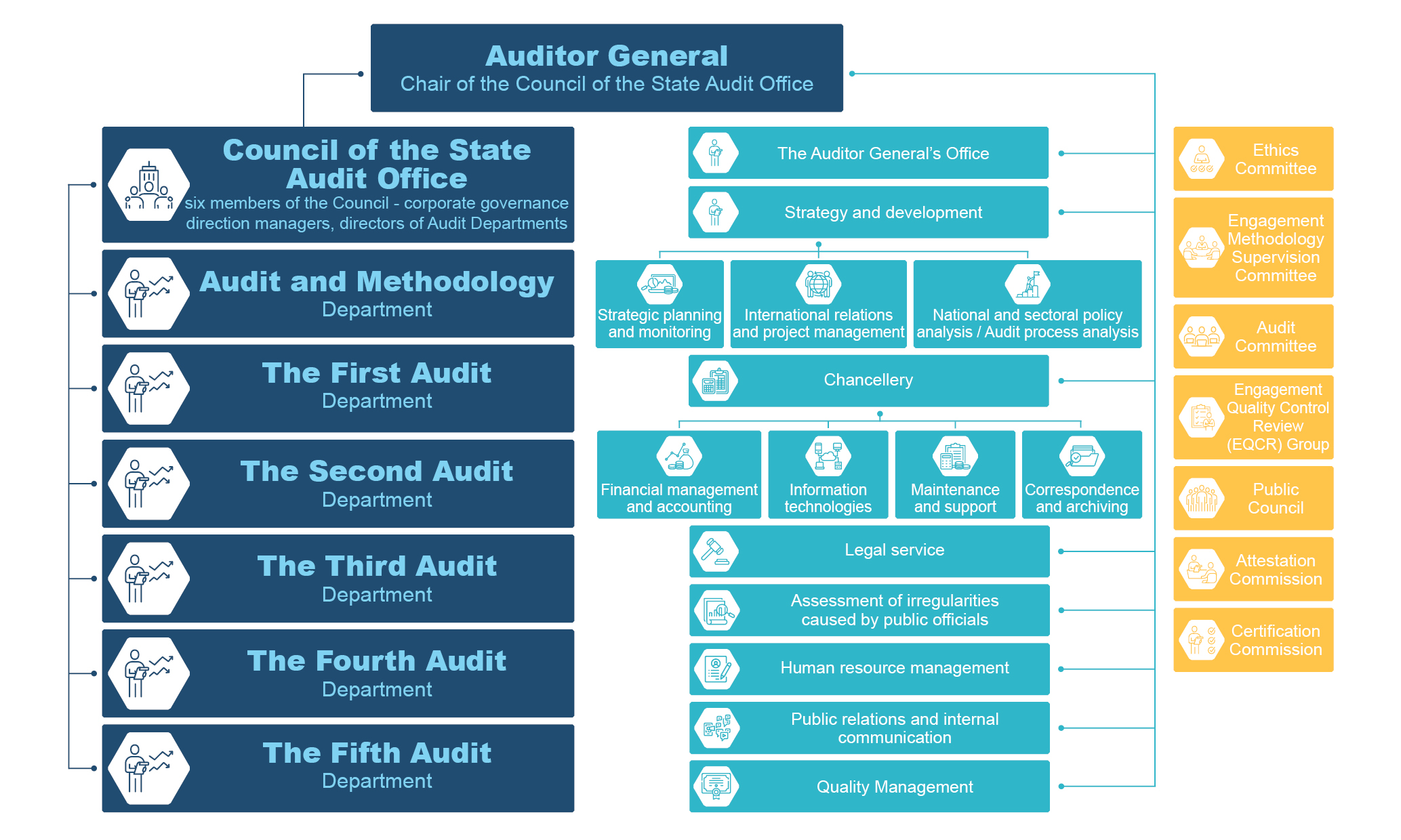 Structural units ensuring support functions provide day-to-day administrative processes and support to auditing work. This includes the Auditor’s General Office’s management, strategic planning and development, HR management, legal support, assessment of irregularities caused by public managers, public relations and internal communication. The strategic planning and development function covers planning and monitoring, international relations and project management, national and sectoral policy analysis and audit process analysis. The Chancellery performs financial management and accounting, provides IT support, organises record keeping and daily office maintenance. Quality management function is directly subordinated to the Auditor General.