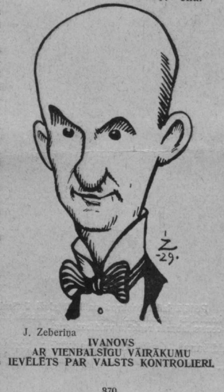 Karikatūra - "Ivanovs ar vienbalsīgu vairākumu ievēlēts par valsts kontrolieri". Autore J. Zeberiņa. Svari, Nr. 47., 22.11.1929. Latvijas Nacionālā bibliotēka